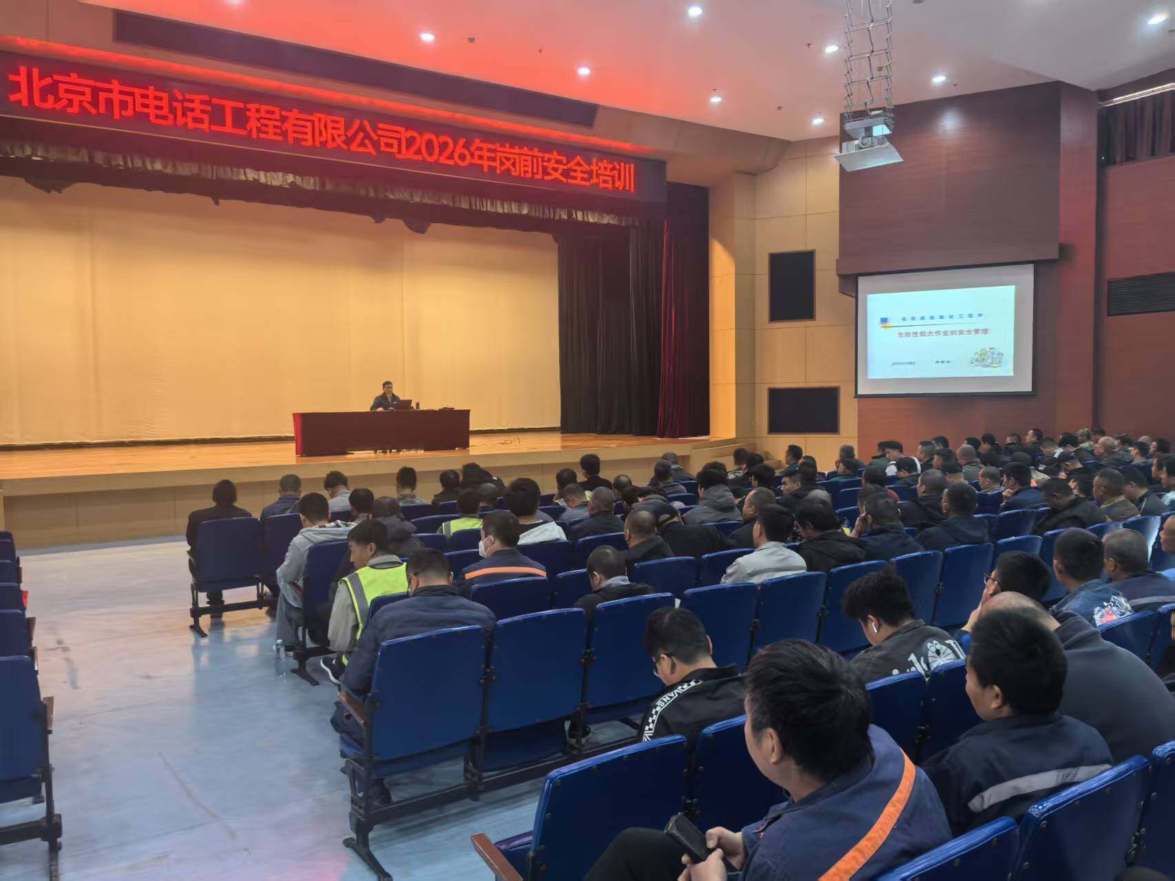 为全面落实通信行业安全生产管理规范,从严抓实施工现场风险防控工作,切实筑牢企业安全生产防线。3月28日,北京市电话工程有限公司2026年施工从业人员岗前安全生产综合教育培训在京顺利举行。本次培训紧扣公司年度安全生产工作部署,严格遵循安全生产“三级教育”体系要求,聚焦通信施工全流程安全管控,全力提升从业人员安全素养与作业规范意识。